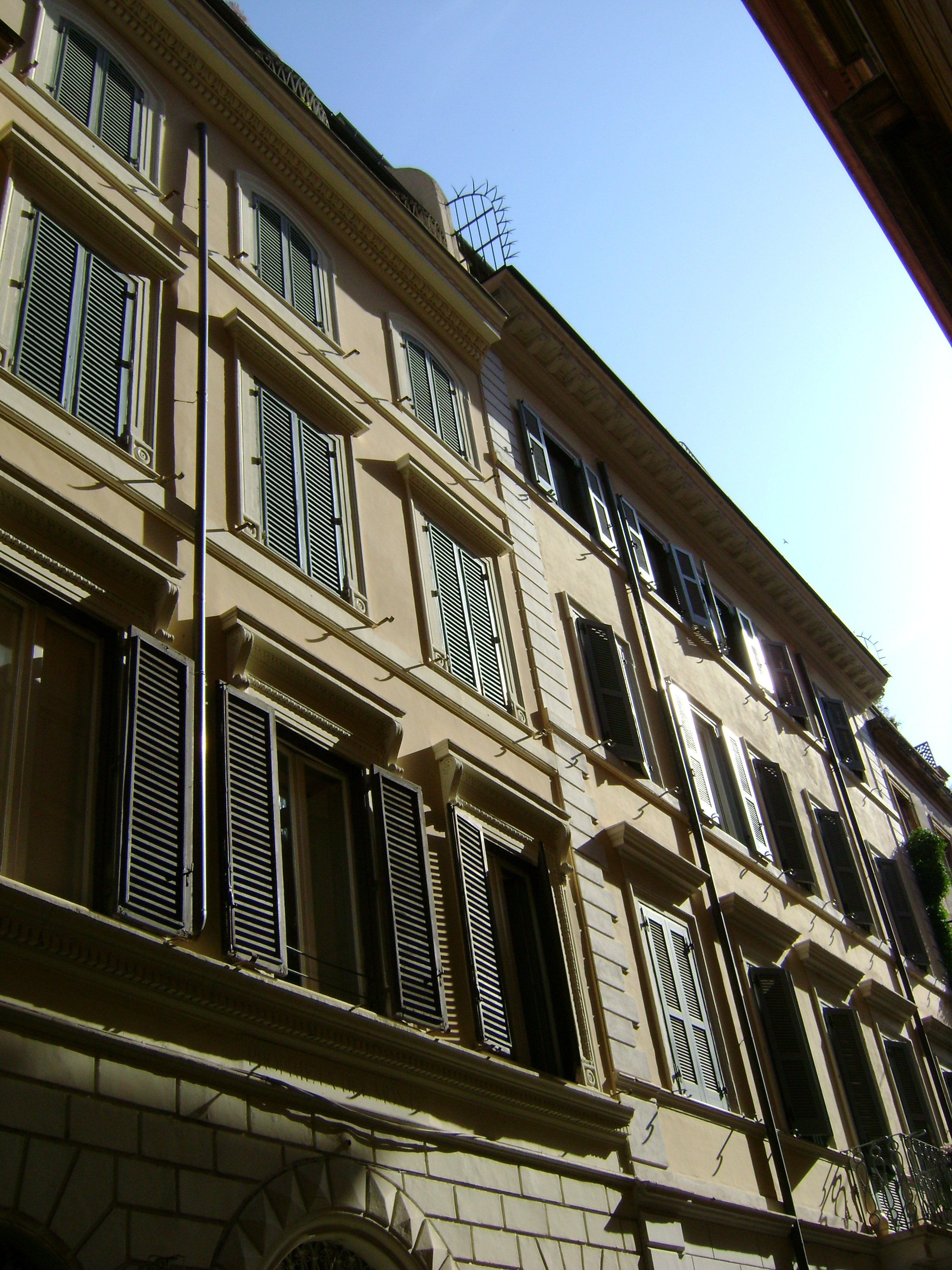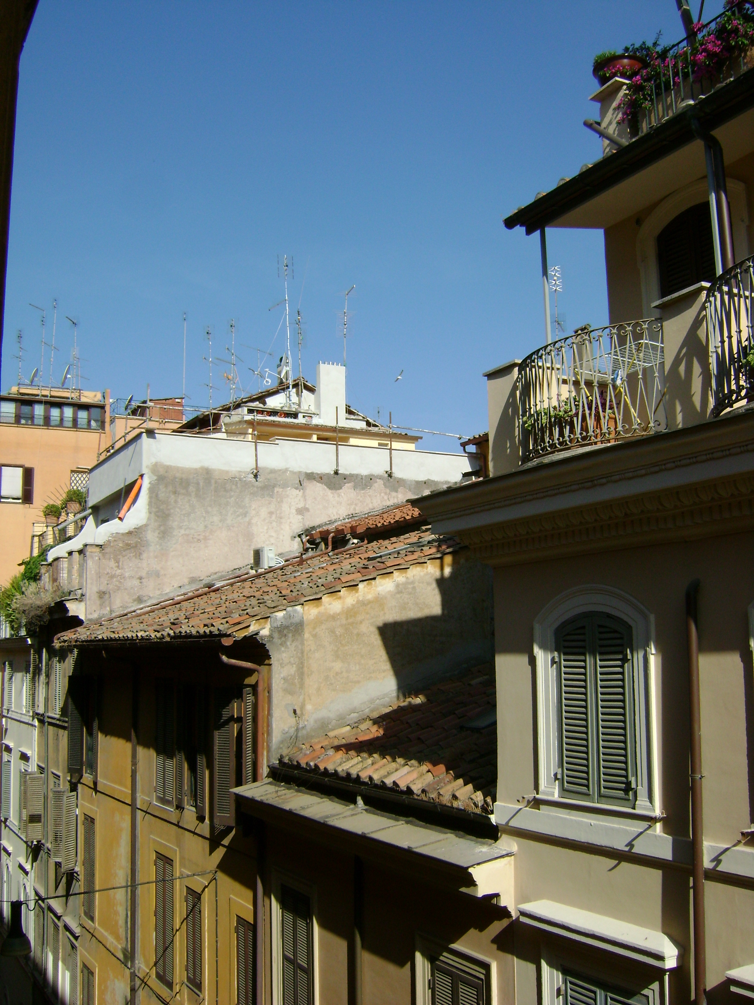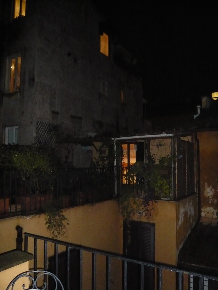 Now, some visuals for you to help you understand my path to safety. I returned to Rome in June 2009 for an interview with the Public Prosecutor. The morning of my interview, I returned to the street where Marco lived. I had a bodyguard with me. Together, we were able to gain access to the building across the street from Marco’s and climb to the top/fourth floor to take pictures.