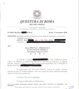 The Wednesday before Thanksgiving, as you know, is usually a quiet one at the office. The whole three days back at work had been blissfully quiet as I eased myself back into my normal routine. That Wednesday morning, I was going about my business when I checked my Hotmail. With all the back and forth emails with the Embassy and my State Department contact, I kept it open and minimized on my screen, afraid to miss the slightest communication. Imagine my surprise when I opened an email from my State Department contact who apologetically explained that he had forgotten to forward me three papers I needed to sign, approve and get back to him – and to the Rome Police – by Friday morning. With the time zone difference and the holiday looming, that pretty much left me with half a day to get things done.