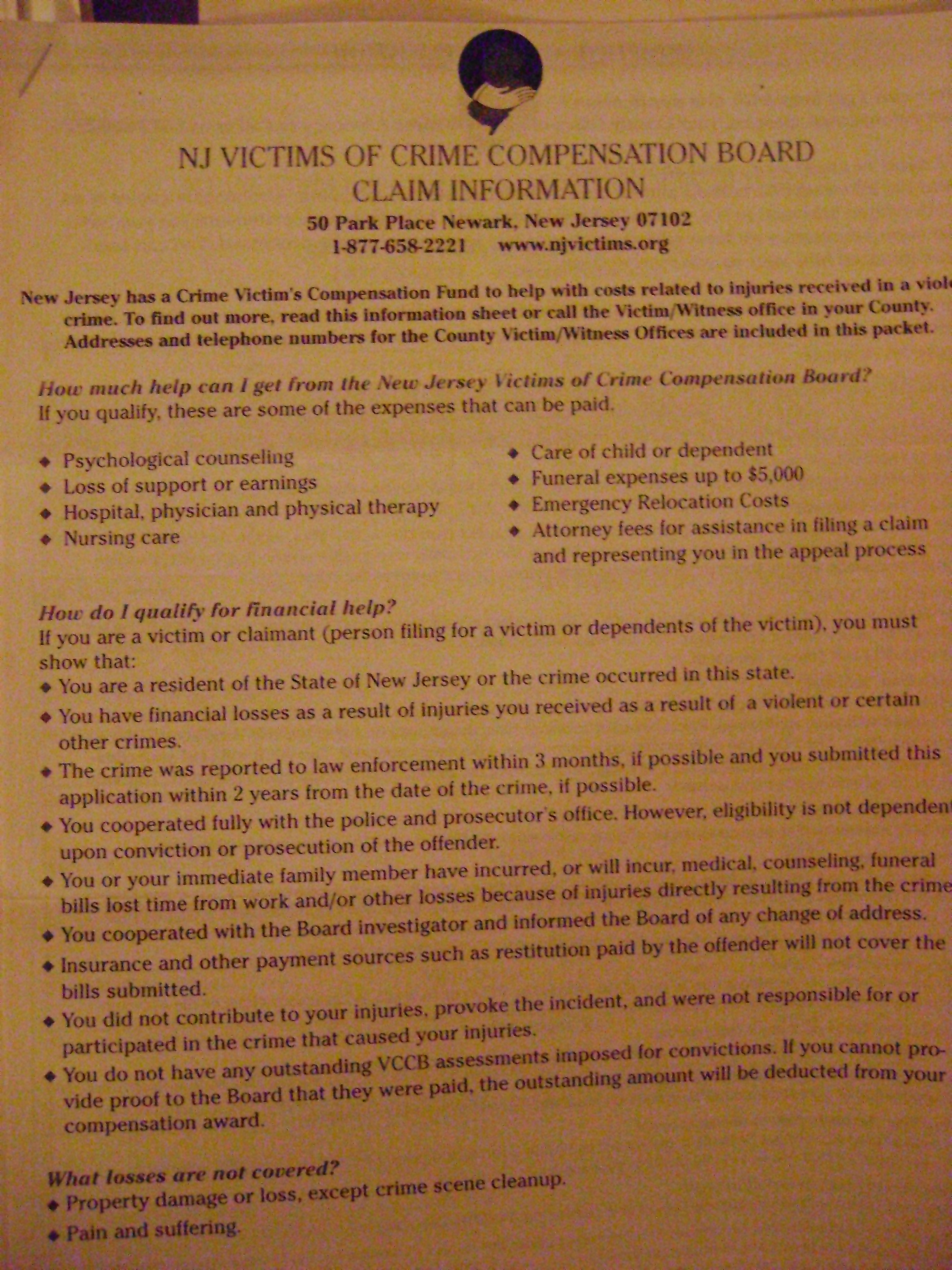 I received the forms in a week or so and looked through them. First you should know that there is a time limit on when you can file. For NJ, you can file up to but not beyond two years after the date of the crime (and you had to have reported the crime within 90 days of it happening). Second, the NJ program is geared toward people who have suffered documentable injuries that prevent them from working/earning wages and result in other quality of life losses. There is some assistance with attorney costs, crime scene cleanup, emergency costs, etc. For me, the part that was relevant was costs of travel to and from court hearings; if I had to go back to Rome, I could possibly qualify (turns out, I didn’t), so I would check back in with the form every few weeks as my case progressed (and my costs increased).