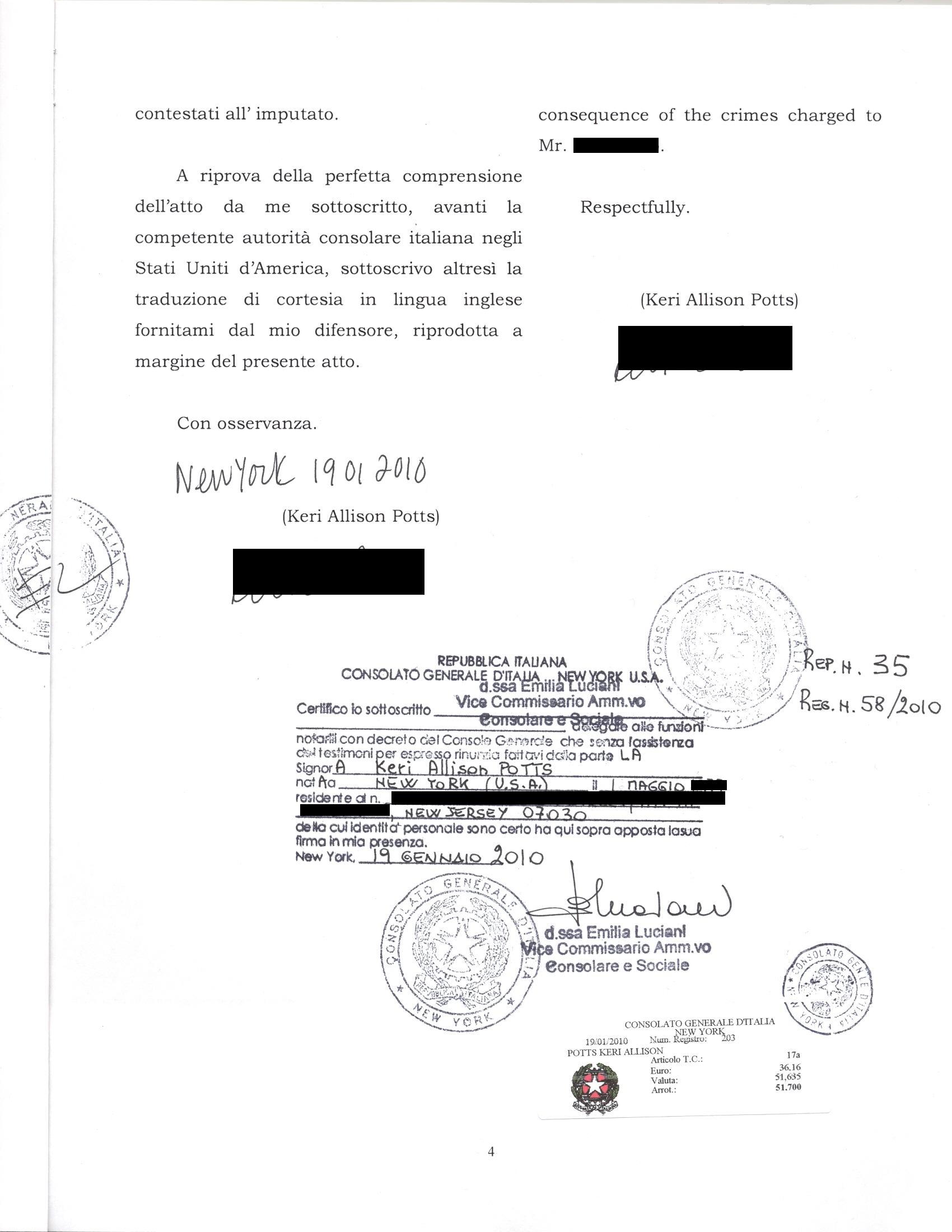 I headed to my office in NYC and loaded up the document as a PDF so that my attorney could see if it was correctly stamped. The cost to overnight the document in time for the January 28 pre-trial hearing would be around $110 and we both wanted to be sure I had what I needed before heading to FedEx. So, of course, Valentino took one look at the PDF and called me with his displeasure. The consular officer had not performed the duties he needed her to, and he told me – to my great annoyance – that I’d have to go back and do it all over again. Except this time, he arranged an appointment for me with the Italian Consulate of New York for a few days later. At least I wouldn’t have to go to Newark again.